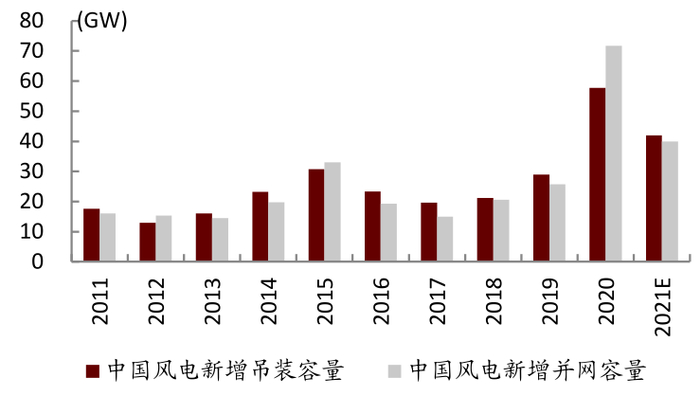 2021年新增装机仍有望维持较高水平。最近的行业招标量已经较2020年抢装时期开始回暖,4Q20-1Q21合计行业招标量达到28GW以上(基本为陆上项目),加上此前招标的超过10GW海上风电的项目和更早的陆上项目,已经能够保证2021年大部分新增规模。我们预计2021年国内新增并网容量有望达到40GW以上,虽然较2020年的高位有所下滑,但与2020年产业链实际供应量相近,且仍然高出除2020年外的过往年份的水平。