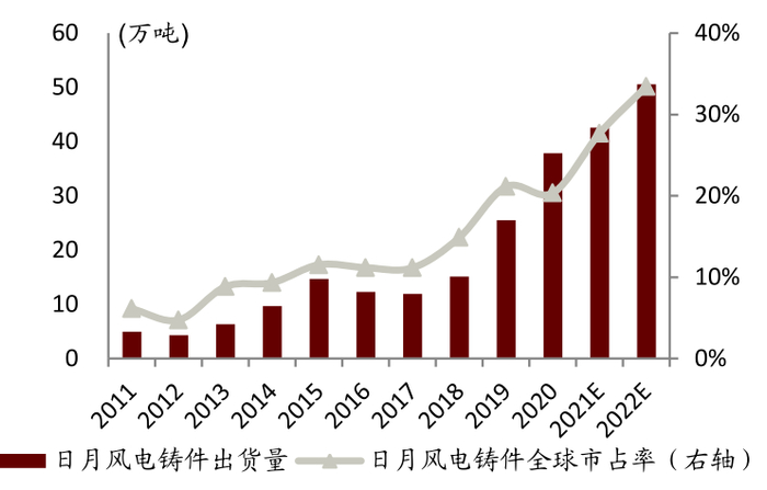 图表: 日月股份风电铸件出货量及全球市占率预测