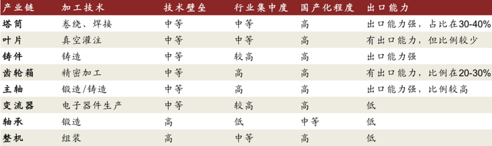 注:出口较少的环节如叶片、变流器、海缆、整机采用国内市占率,其他环节采用全球市占率