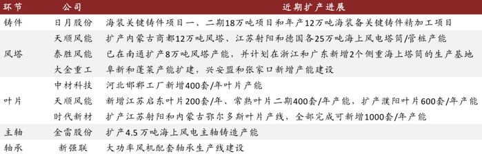 头部的零部件厂商在抢装开始后在持续扩充先进产能,主要侧重于大兆瓦和海上风电的配套,有望持续提升领先优势。例如,1)铸件:日月股份新增海装铸造和精加工产能;2)风塔:天顺风能新增三北大基地和海上塔筒产能,泰胜风能计划新增2个海上风塔产能,大金重工新增蓬莱海上风塔产能和三北大基地的陆上风塔产能;3)叶片:中材科技、天顺风能等公司积极扩产配套大功率风机的叶片产能;4)主轴:金雷股份扩产海上风电铸造主轴产能;5)轴承:新强联计划扩产3MW及以上功率风电轴承产线。