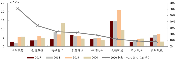 图表: 中国主要风电零部件企业出口收入和出口收入占比(2017-2020)