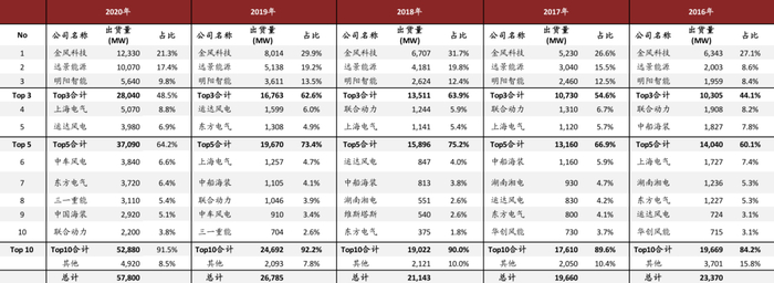 图表: 2016-2020中国市场风电整机出货量排名及占比