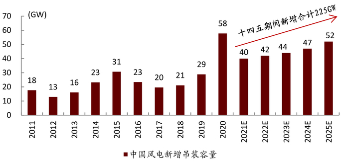 综上,我们认为中国十四五陆上与海上合计新增风电需求有望达到225GW以上,年均45GW以上。
