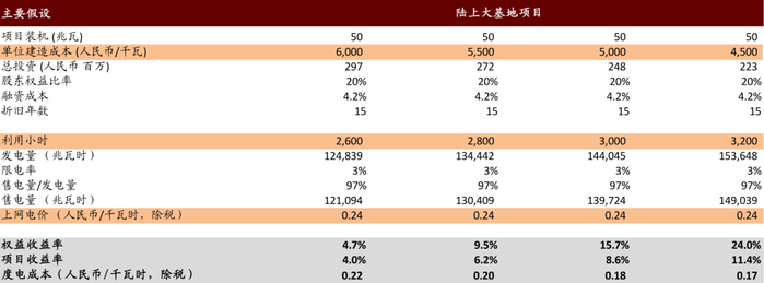 机组大型化持续推动风电度电成本下降。更大的风轮直径和更高的轮毂高度能够使机组在风速较低的地区获得更多动力,在机组功率提升的同时提升利用小时数。同时风机成本只占风电场总成本的不到60%,单个机组功率的增加能够摊薄单位机组的其他各项成本(机位点、土地、线路、运维等),综合使度电成本降低。以陆上大基地项目为例,我们测算随着机型从2.0MW提升至5.0MW,在上述风机理论招标价和上网电价为0.24元/度(除税)的情形下,项目收益率有望从4.0%提升至8.6%,考虑更多规模效应和运费节省等因素,项目收益率有望继续提升至11.4%。