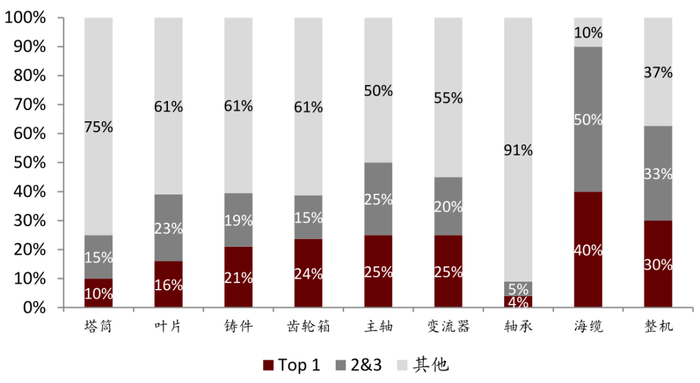(2)塔筒、叶片和整机环节仍然存在相对激烈的竞争,我们认为这些环节的头部企业合计市占率有望保持提升趋势,但同环节之间存在相当的竞争压力;