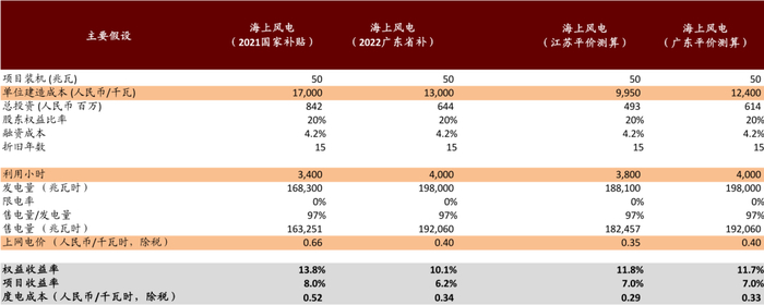 海上风电仍需补贴接力。陆上风电已经在2021年在国内多地满足平价要求,即便考虑2022年开始海上风电抢装后整机和海工成本下降,也很难有众多项目能够在沿海省份标杆电价下实现合理收益率,因此仍然需要补贴接力。以广东省此前公布的海上风电补贴征求意见稿为例,广东计划2022、2023年给海上项目分别每千瓦补贴1,500、1,000元,累计补贴项目容量不超过4.5GW(其中2022年补贴不超过2.1GW),我们测算该种情况下以大功率风机和较好风资源条件下4,000的利用小时,项目收益率可以达到6.2%,基本满足运营商投资回报标准。