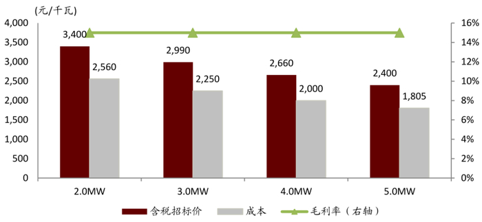 注:理论成本根据图表10中单位功率重量下滑测算,并假设15%的毛利率反推出理论招标价;未考虑原材料价格变动影响;与实际情况可能存在偏差,不代表厂商口径
