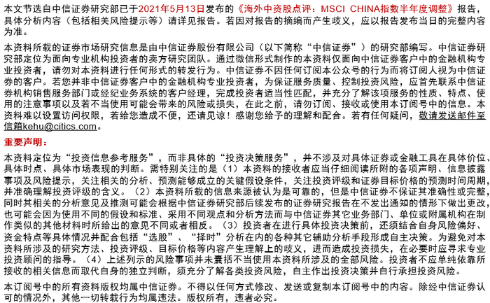 原标题:海外中资股|MSCI CHINA指数半年度调整 来源:中信证券研究