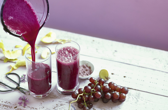 2、将处理好的提子取一部分放入搅拌机中,加入适量气泡水,之后将其搅打成提子果泥,之后取一个筛网,将提子泥过筛,去掉较粗的部分,保留细腻的部分,备用;