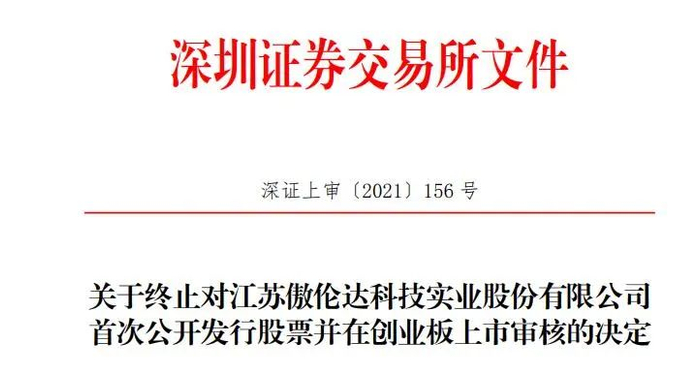 深交所官网13日消息,深交所决定终止江苏傲伦达科技实业股份有限公司(以下简称“傲伦达”)首次公开发行股票并在创业板上市审核。