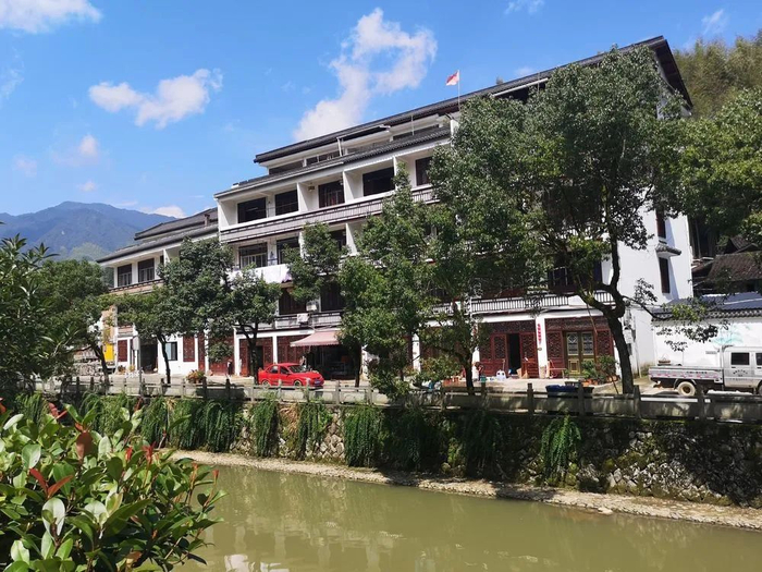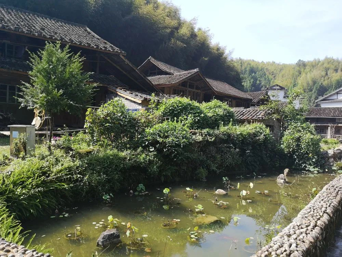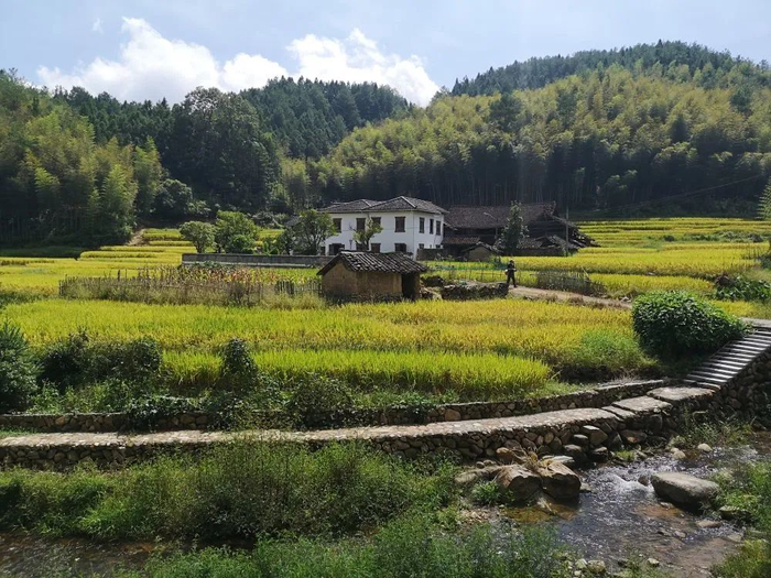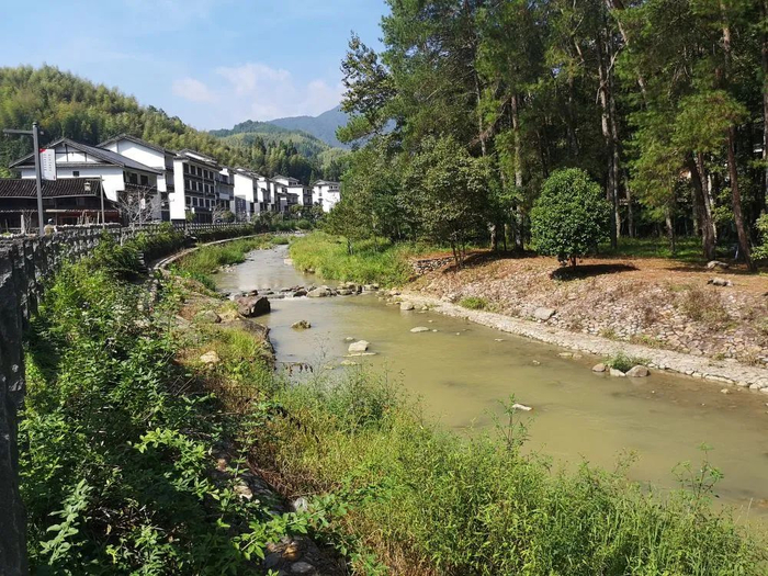 蓝天白云下,淙淙溪水边,一幢幢徽派建筑风格的民居掩映在绿荫之中。踏过溪上的碇步桥,来到溪北。古树下,有几位村民坐在椅凳上聊天。有青山绿水环绕,生活恬淡而富足,他们的日常,正是别人眼中幸福的模样。