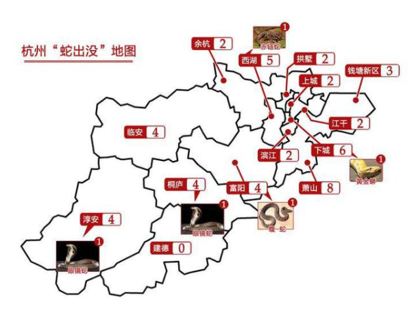 他表示,杭州的蛇有80%是菜花蛇,无毒,而在千岛湖、桐庐等山区的居民区里,也经常会出现眼镜蛇、银环蛇。