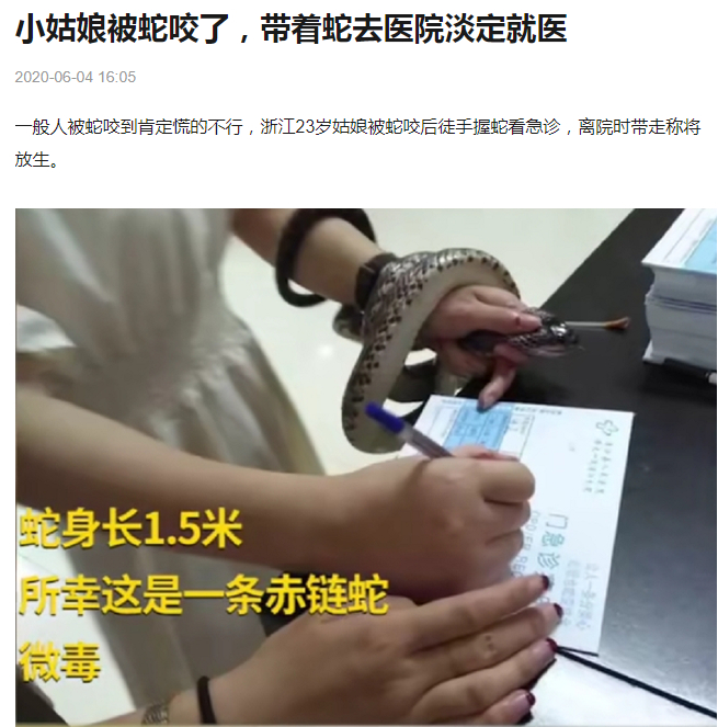 一位去草丛里捡手机被蛇咬伤的年轻女子,因为不知道蛇是否有毒,便带着蛇来医院,她称万一是毒蛇,可以在辨认后选用有针对性的抗蛇毒血清。