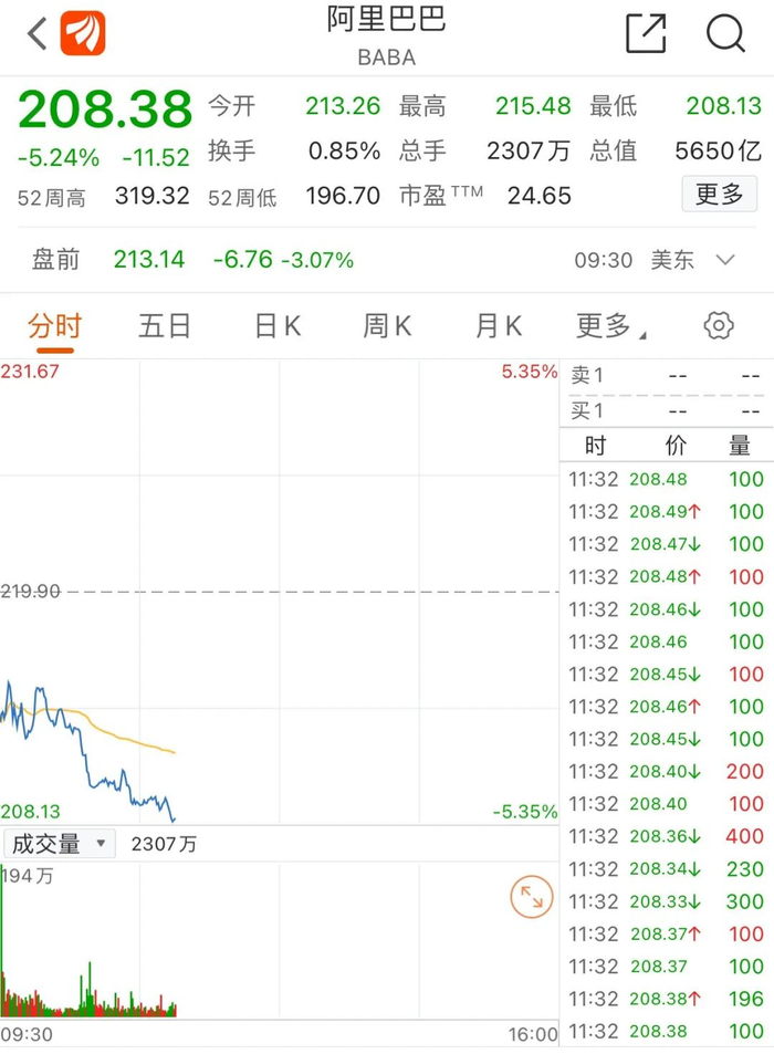 数据显示,今年一季度经营亏损76.54亿,阿里巴巴美股盘前跌3%。截至北京时间23:30,阿里巴巴跌幅超5%,报208.38美元/股,股价较去年10月创下的峰值下跌了30%以上,目前股价为去年7月份以来最低。
