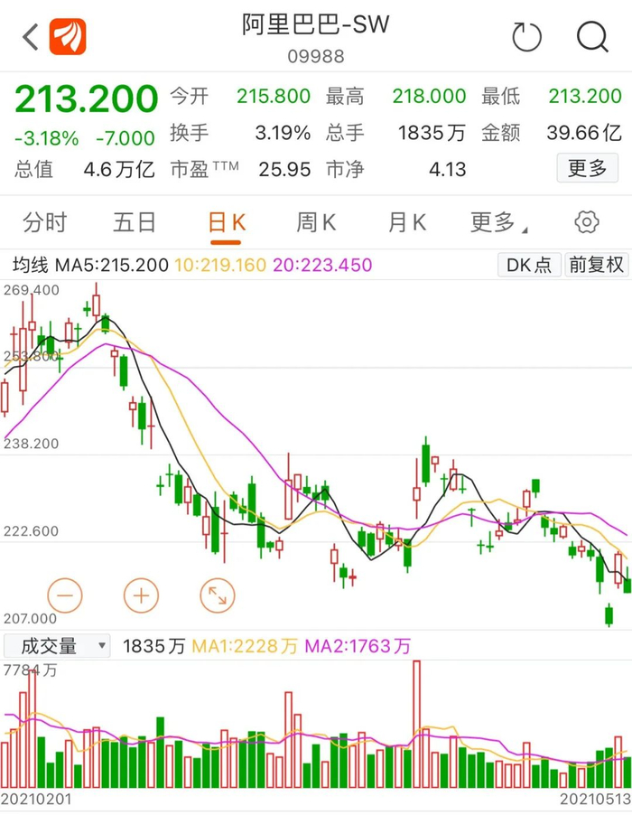 截至5月13日港股收盘,阿里巴巴港股报收213.2港元/股,当日跌3.18%。wind显示,自去年10月30日至今,阿里巴巴港股期间股价跌幅已达28%;阿里巴巴美股自319.32美元的高点一度最大跌落至211.23美元,总市值蒸发超过2500亿美元(折合人民币超16000亿元)。