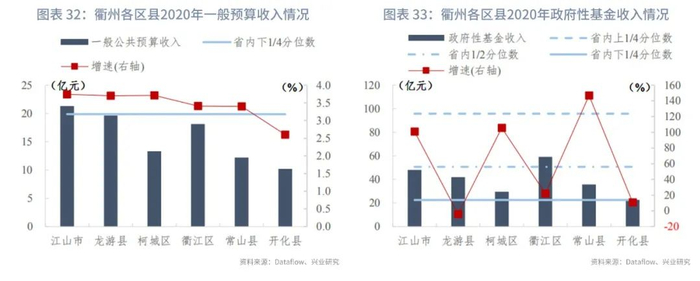 衢州市各区县一般预算收入规模较小,基本处于全省下1/4分位,2020年一般预算收入全部实现正增长。其中,江山市和龙游县分别以21、20亿元的规模位居衢州市前二,增速均为3.7%;开化县一般公共预算收入规模最小,同比增长2.6%至10亿元。政府性基金收入方面,除龙游县的所有区县均实现正增长,其中,衢江区同比增长22%至59亿元,位列衢州市第一;常山县增速全市第一,同比增长146.8%至36亿元。