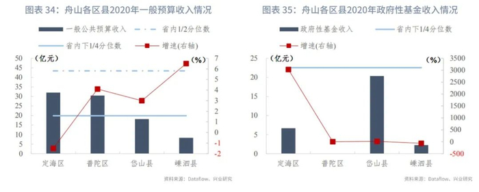 舟山市各区县一般预算收入规模较小,全部处于全省后50%,一般预算收入除定海区外全部实现正增长,其中,定海区以32亿元的规模位居舟山市第一,同比减少1.5%;嵊泗县规模最小,仅为8亿元,且与其他区县差距较大。政府性基金收入方面,各区县规模均位于全省后25%,岱山县以20亿元的规模位列舟山市第一,增速为15.6%。