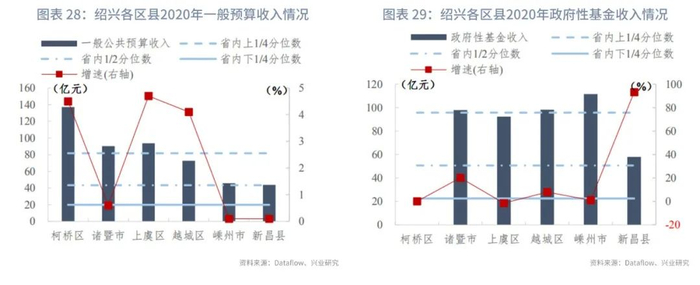 绍兴市各区县一般预算收入规模较大,各区县规模全部高于省内1/2分位数且均实现正增长,其中,柯桥区以137亿元的规模位居绍兴市第一,同比增长4.5%;新昌县一般公共预算收入规模最小,同比增长0.1%至44亿元。政府性基金收入方面,除上虞区外,其余区县实现正增长,其中,嵊州市规模最大,同比增长1.1%至112亿元,而新昌县增速最高,同比增长93.2%至58亿元。