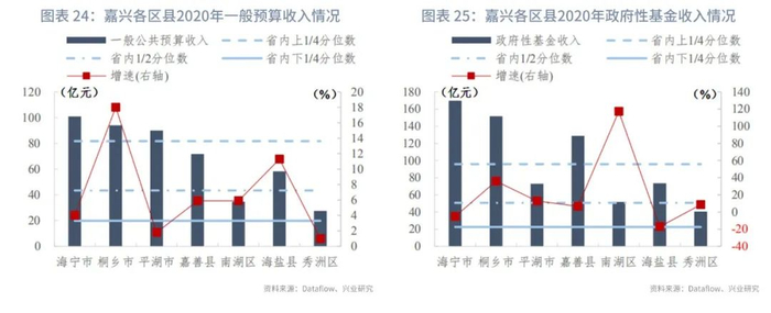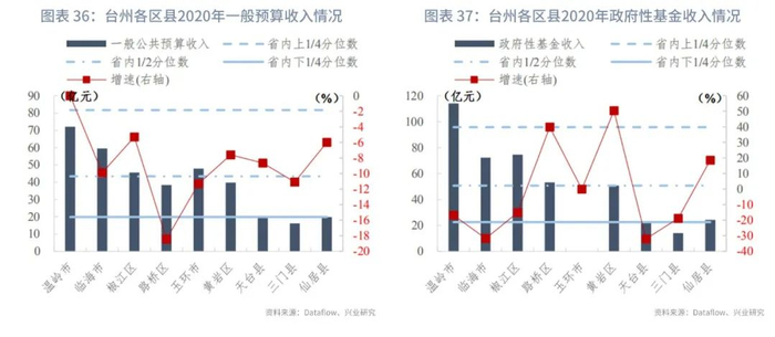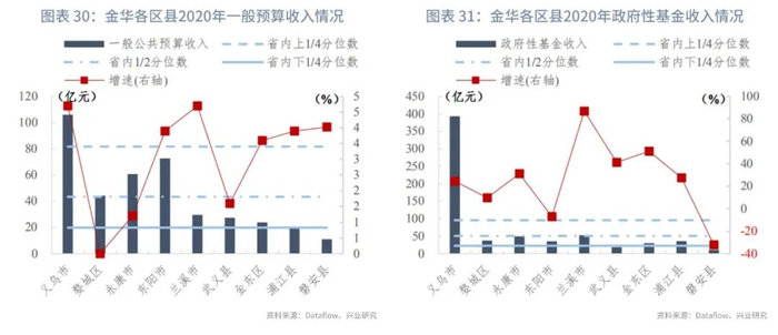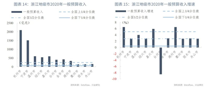 分区县来看:我们统计了浙江省90个区县的一般预算收入及政府性基金收入。在已披露数据的区县中,一般预算收入的下1/4、1/2、上1/4分位数分别为20亿元、43亿元和82亿元,一般预算收入同比增速的下1/4、1/2、上1/4分位数分别为1.30%、3.70%和5.90%。政府性基金收入的下1/4、1/2、上1/4分位数分别为23亿元、51亿元和96亿元,政府性基金收入同比增速的下1/4、1/2、上1/4分位数分别为-2.99%、20.24%和51.21%。