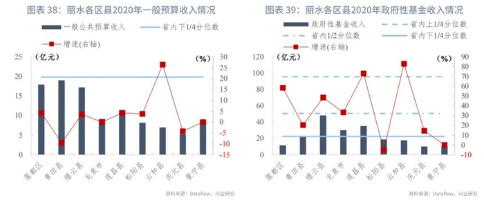 丽水市各区县一般预算收入规模较小且基本相近,全部处于全省下1/4分位以下,2020年一般预算收入大多实现正增长,其中,青田县以19亿元的规模位居市内第一,但同比增速为-9.5%,为全市负增长最多的区县;庆元县一般预算收入规模最小,同比减少4.2%至5亿元。政府性基金收入方面,2020年除松阳县外的所有区县均实现正增长,其中,缙云县以50亿元的规模位列丽水市内第一,且同比增速也较高,达48.5%;庆元县、景宁县政府性基金收入规模最小,约为10亿元。