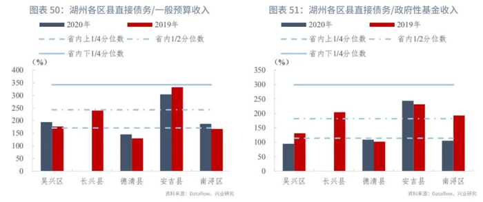 湖州市下辖区县的政府直接债务负担整体一般,差异较大。从直接债务/一般预算收入指标来看,最高的安吉县(304.18%)远高于吴兴区(194.39%)、南浔区(187.32%)和德清县(145.67%),其中德清县的指标优于全省上1/4分位。从指标变动来看,除安吉县下降了28.25个百分点外,其余各区县均有不同程度上升。从直接债务/政府性基金收入指标来看,安吉县的直接债务/政府性基金收入指标最高,高于全省1/2分位数,为243.76%;吴兴区(94.98%)的直接债务/政府性基金收入指标最低。与2019年指标相比,南浔区的直接债务/政府性基金收入指标降幅最大,下降了87.63个百分点;安吉县(上升12.12个百分点)、德清县(上升7.22个百分点)均有所增加。