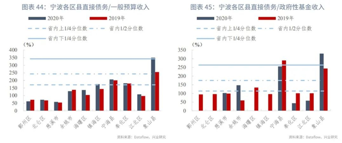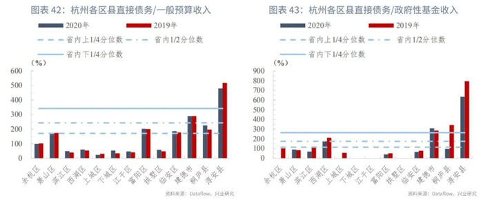 分区县来看,截至2020年末,浙江省各区县直接债务/一般预算收入的上1/4、中位数和下1/4分位数分别为171.10%、243.03%、342.30%,指标变动的上1/4、中位数和下1/4分位数分别为9.00个百分点、33.99个百分点、71.96个百分点。部分市辖区政府性基金收入极低,主要是由于上缴市财政之后通过补助收入返还,因此政府直接债务/政府性基金收入暂不计算,剔除这些区县后其他区县的直接债务/政府性基金收入的上1/4、中位数和下1/4分位数分别为113.77%、174.76%、263.75%,指标变动的上1/4、中位数和下1/4分位数分别为-37.72个百分点、2.90个百分点、32.18个百分点。