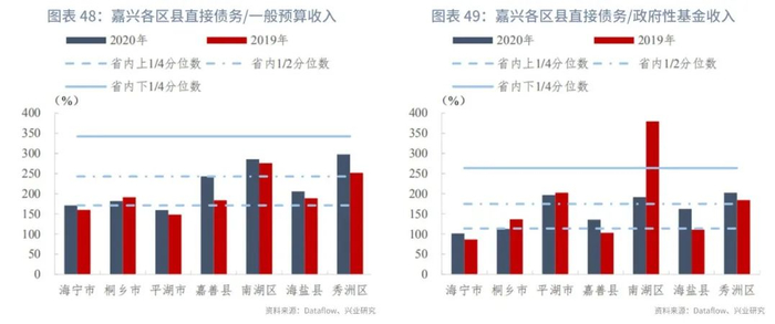 嘉兴市下辖区县的政府直接债务负担整体一般,各区县的直接债务/一般预算收入指标处于全省上1/4分位至下上1/4分位间,最差的是秀洲区(297.83%)。从指标变动来看,除桐乡市下降了9.19个百分点外,其余各区县均有不同程度上升。从直接债务/政府性基金收入指标来看,秀洲区的直接债务/政府性基金收入指标最高,高于全省1/2分位数,为202.50%。与2019年指标相比,南湖区的直接债务/政府性基金收入指标降幅最大,下降了187.88个百分点;海盐县的增幅最大,增长了51.34个百分点,增幅高于全省3/4的区县。