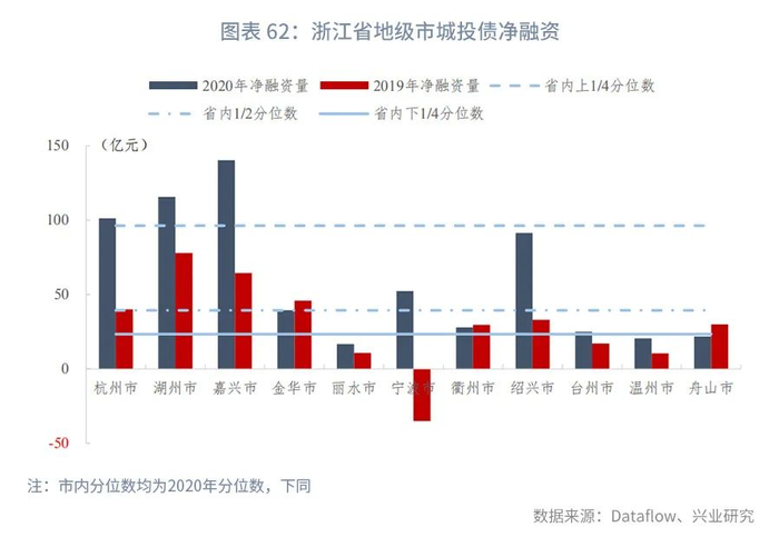 兴业研究覆盖196家浙江省城投平台,我们统计了浙江省11个地级市、90个区县的城投债融资数据。截至2020年末,城投平台债券发行量合计8297亿元,同比增长43.52%;2020年净融资规模2516亿元,同比增长68.32%。从地级市层面来看,各地级市2020年的城投债净融资规模普遍扩大,嘉兴市城投债的净融资逾140亿元,其他净融资额超过100亿元的地级市分别为湖州(116亿元)和杭州(101亿元);舟山、金华和衢州的城投债净融资规模同比略有下滑,分别为较2019年减少8亿元、7亿元和2亿元。