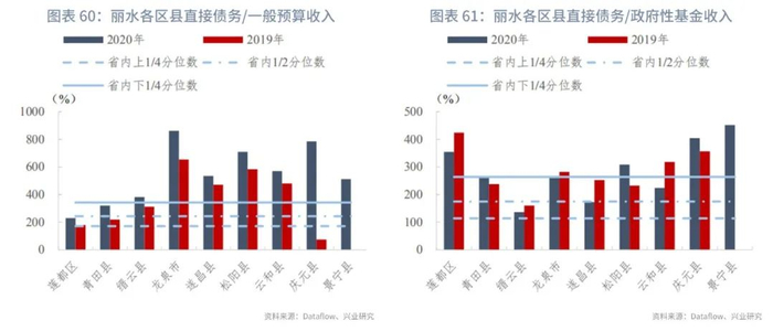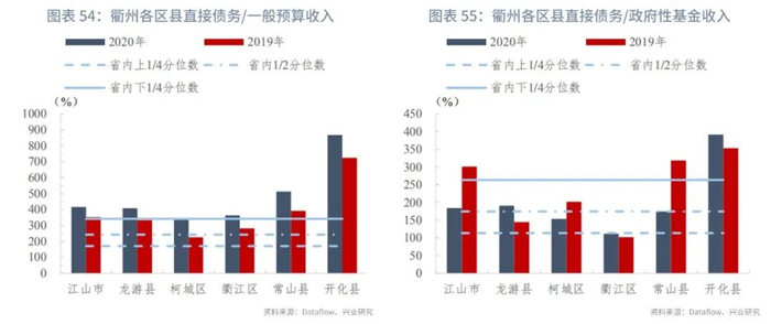 我们用政府直接债务/一般预算收入、政府直接债务/政府性基金收入两个指标观察浙江省区县的政府直接债务负担变化。