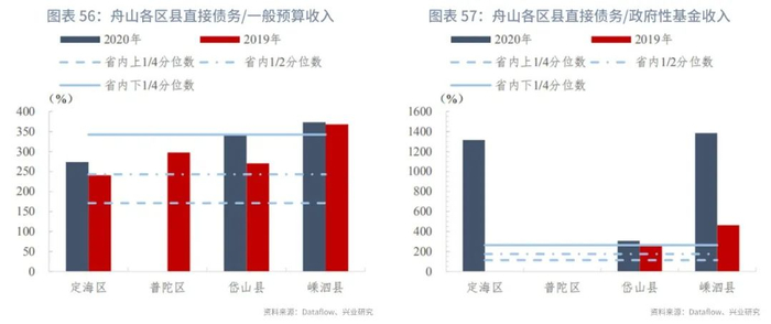 舟山市下辖区县的政府直接债务负担整体较大,从直接债务/一般预算收入指标来看,定海区、岱山县、嵊泗县分别为273.58%、344.08%、373.16%,高于全市1/2分位数。与2019年相比,所有区县指标值上升;其中,岱山县上升幅度较大,上升超过70个百分点,处于全市上升幅度最大的25%区间内。从直接债务/政府性基金收入指标来看,岱山县指标值为306.47%,高于省内下1/4分位数;定海区、嵊泗县的指标值超过1300%,系全省前三。与2019年指标相比,嵊泗县同比大幅上升约920个百分点.