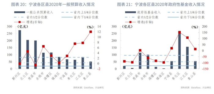 宁波市各区县一般预算收入规模较大,多数区县处于全省上1/4分位以上,2020年一般预算收入增速呈现出两极分化。其中,鄞州区以273亿元的规模位居宁波市第一;而一般预算规模较小的象山县、江北区、奉化区增速均较高,分别为12.0%、7.8%、7.5%。政府性基金收入方面,各区县规模分化,奉化区以269亿的规模位列宁波市第一,同比增长151.6%;镇海区4亿的规模为宁波市内最低,同比减少96.7%,北仑区6亿的规模为宁波市内第二低,同比减少95.3%。