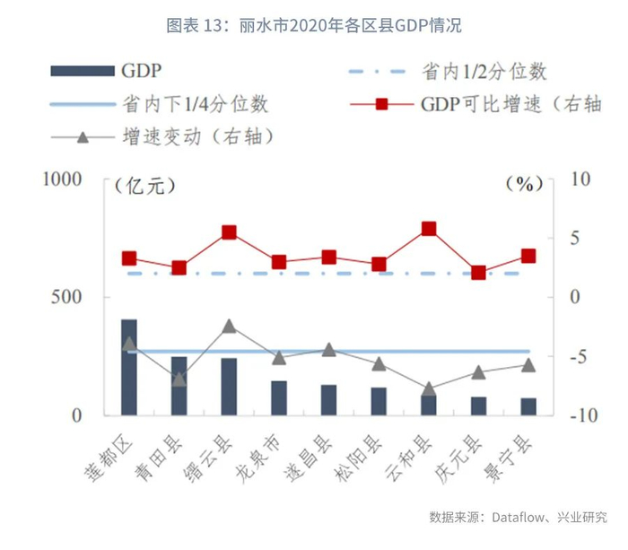 丽水市下辖的9个区县经济体量普遍较小且差异较大,经济增速尚可。莲都区以407亿元的GDP规模位居全市第1,其余各区县的GDP规模均位于全省后25%水平;景宁县的GDP规模最小,仅75亿元。从GDP可比增速来看,云和县增速较高,以5.8%的GDP可比增速位列全市第一;庆元县以2.1%的GDP可比增速成为丽水市增速最低的区县。
