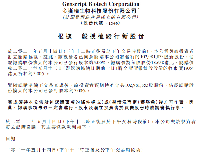 5月14日午后,港股金斯瑞生物科技发布公告,与GNS Holdings Limited订立认购协议,拟向其发行约1.03亿股新股,占经扩大后总股本约5.00%;认购价每股18.658港元。交易完成后,占经扩大后总股本约5.00%,认购价约19.21亿港元。