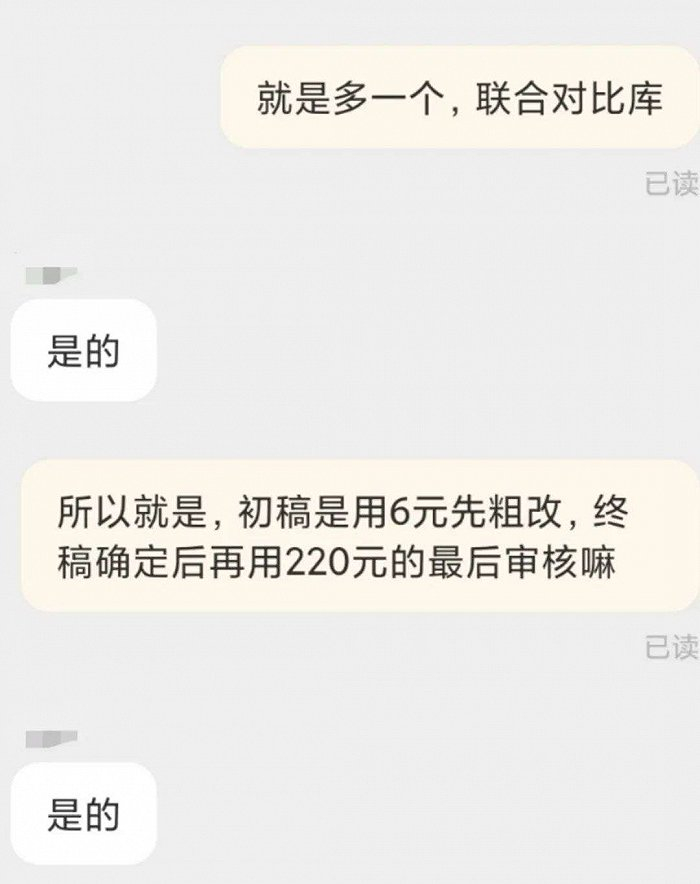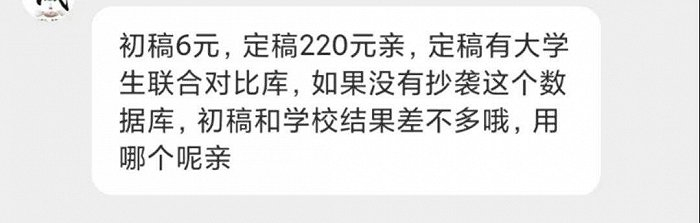 客服表示6元“低配版”仅适用于论文初稿查重,以便于论文“粗改”,该查重结果往往与学校最终查重结果存在较大差距。220元的“高配版”,则与学校知网检测结果基本一致。但事实真的如此吗?