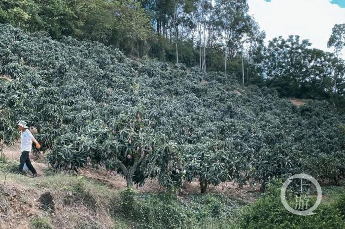 5月11日,上游新闻记者到三角岭实地探访,缓坡上栽种着层层叠叠的芒果树。二季芒果已经挂果,但还未成熟。村民告诉记者,栽在缓坡上的芒果树被喷了药水,起到抑制树长高、催花催果的作用,村民已经不敢在坡下的土地种菜和庄稼。
