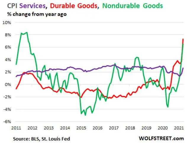 4月份服务业(减去能源服务业)CPI 环比上涨了0.5%,折合年率为6%。耐用品CPI,即汽车、家电、消费类电子产品等耐用品的价格在4月份环比上涨了3.5%,折合年化增长率为42%。