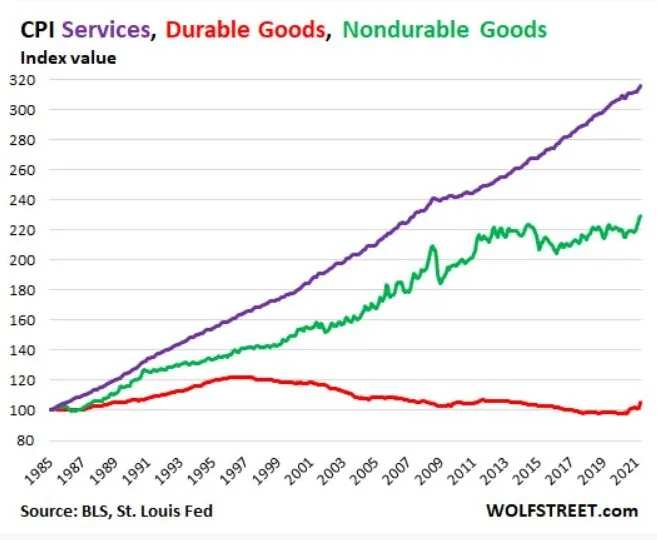 CPI 偏离现实的地方在意,人们「享乐质量」调整了。比如服务业、耐用品和非耐用品在长期以来被扭曲了。