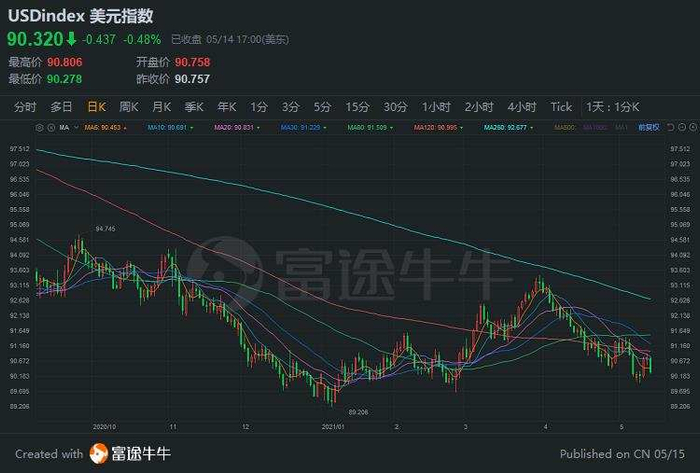 美元指数走势疲弱,截至北京时间5月15日,仍在90关口徘徊。