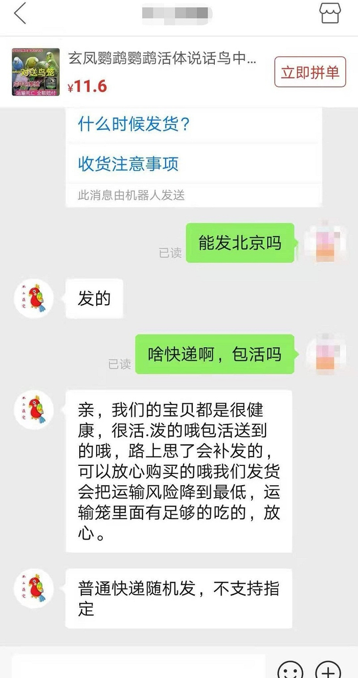 记者随机询问了一些商家,因受中通宠物盲盒事件的影响,部分商家表示已暂停发货,但仍有商家继续正常发货。一家卖鹦鹉的商家告诉记者,店铺可以正常发货,走的是韵达快递。当记者问到宠物怎样“包活”时,商家表示“会把运输风险降到最低,运输笼里面有足够的的食物。”同时,商家承诺如果宠物到货死亡可以补发或者全额赔付。