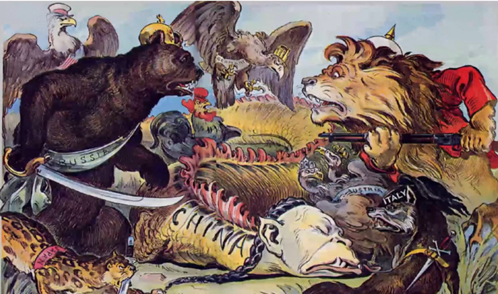那时我们的龙图腾,被外国侵略者画成了梳着长辫、瘫倒在地的羸弱形象。
