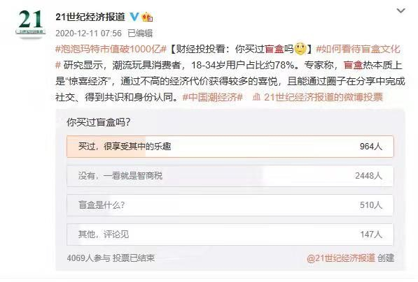 然而,这个回应似乎不能让人满意。21网调实验室调查发现,不足一成的网友表示可以接受此次涨价幅度,两成网友表示无法接受涨价,更有七成网友表示从未买过盲盒,认为这是赤裸裸的“智商税”。