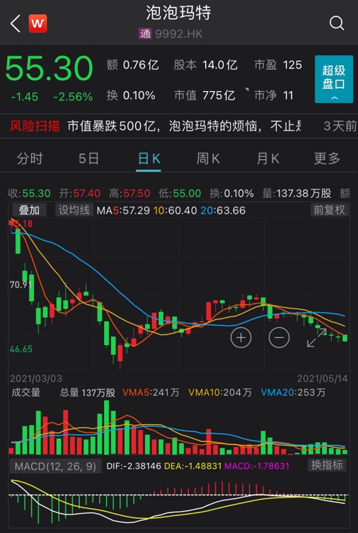 5月14日,泡泡玛特报收55.3港元,与今年2月17日最高价107.6港元相比,股价几近腰斩。截至目前,公司市值为775亿港元,三个月不到已缩水超700亿港元。