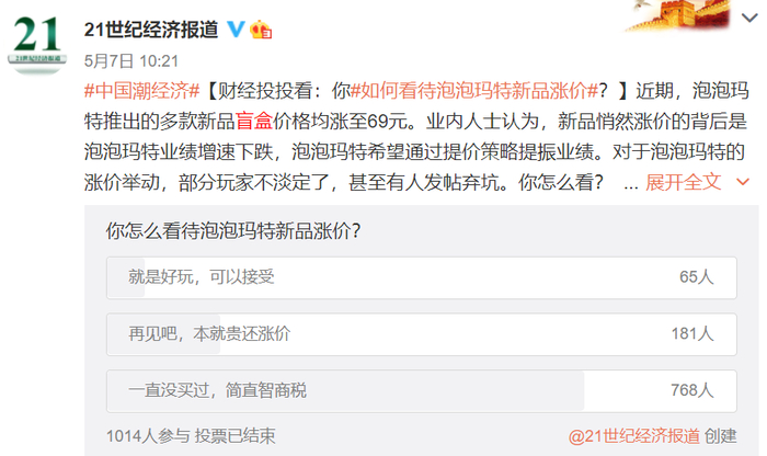 投票数据的分歧同样体现在网友们的评论上。有的认为,真正的“真爱粉”不会因十块钱的涨价而弃坑。也有的反映,不同价位的玩具精细程度不同,且热门款的价格被“炒上天”。多数网友对泡泡玛特的涨价行为并不看好。有网友认为,盲盒59元的主流定价深入人心,涨价或许会自毁市场。还有预测,盲盒的泡沫迟早会破裂。