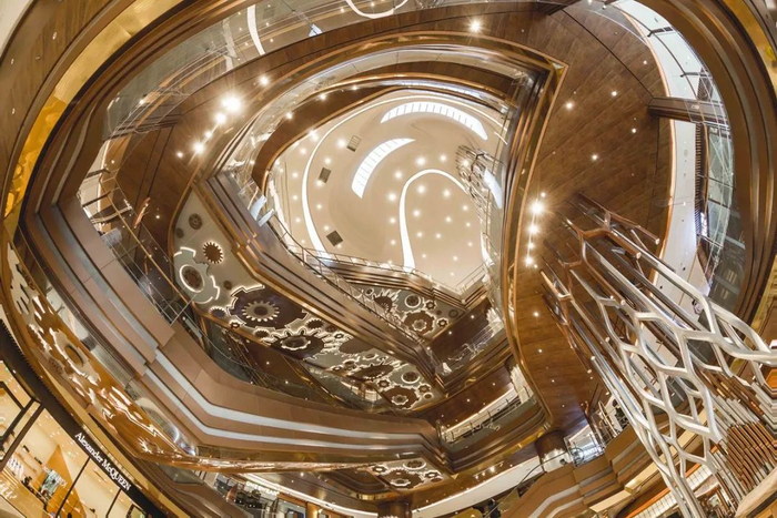 观点地产网 从主入口往里走几步,一架从一楼贯穿至顶层的巨型管风琴赫然呈现眼前,搭配着扶梯底部的齿轮造型、鎏金熠熠的色彩质感,令人不禁赞叹。