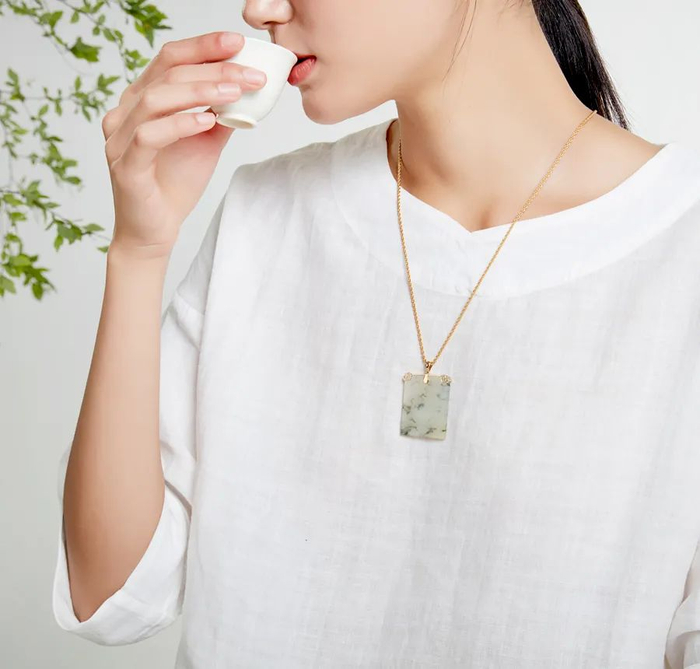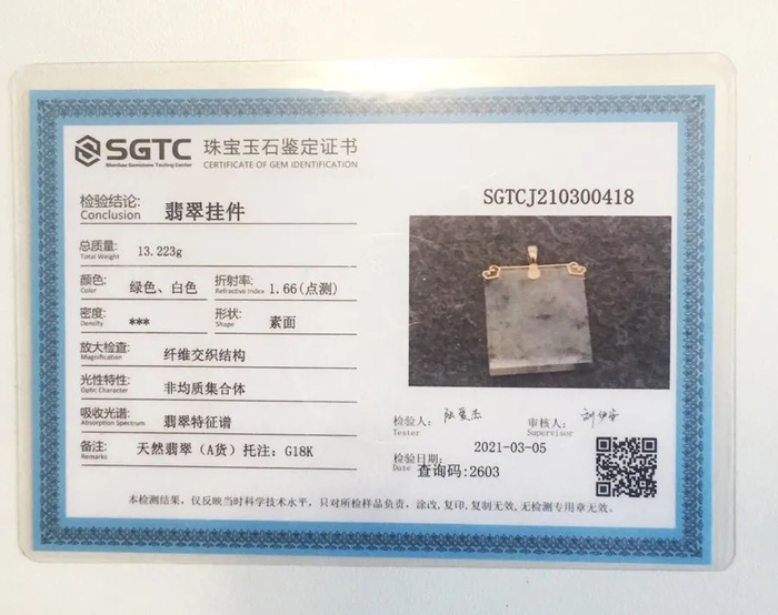 每一款吊坠都会附带成品鉴定证书,证书上标注主石“天然翡翠(A货)”、“G18K”金属材质。