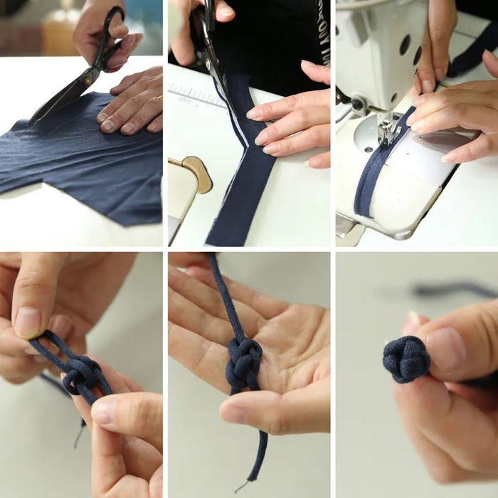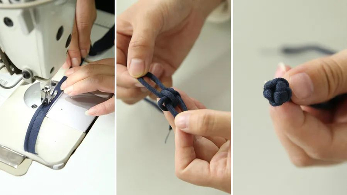 先缝纫出布条,然后手工将盘扣结一个个打好,再缝纫到领口上。