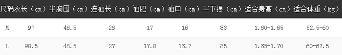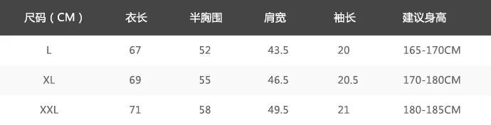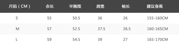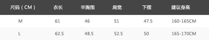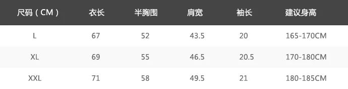 上衣尺码表: