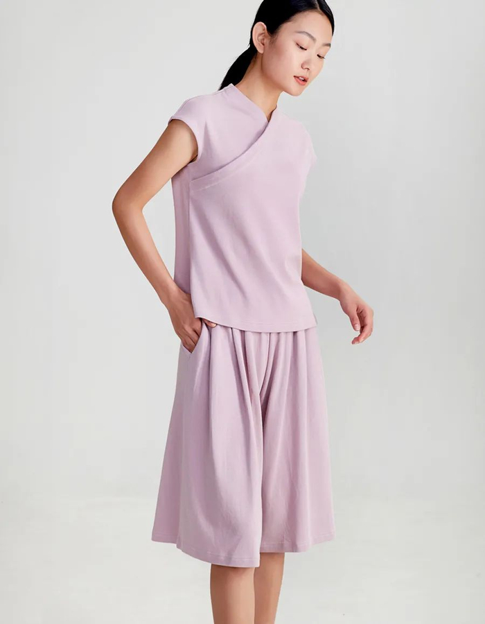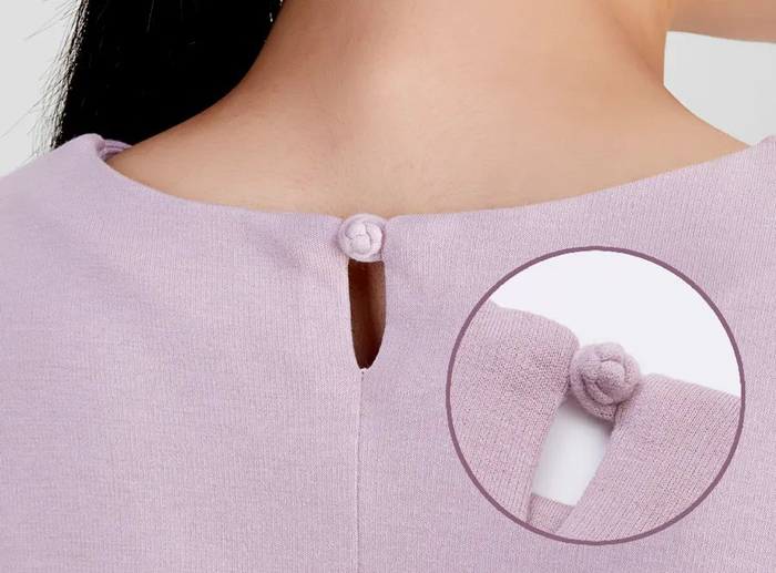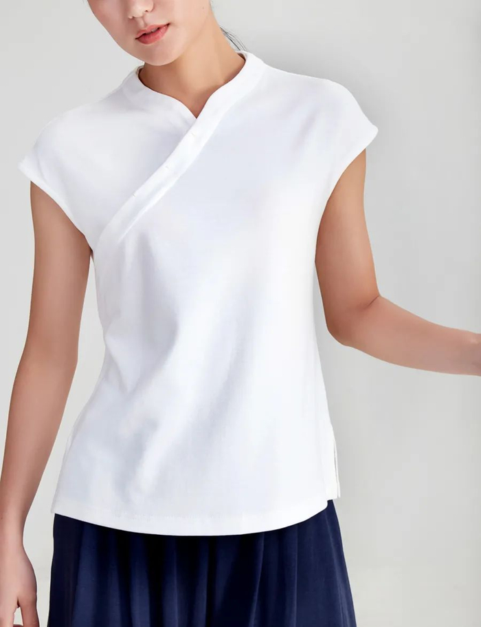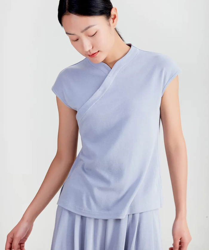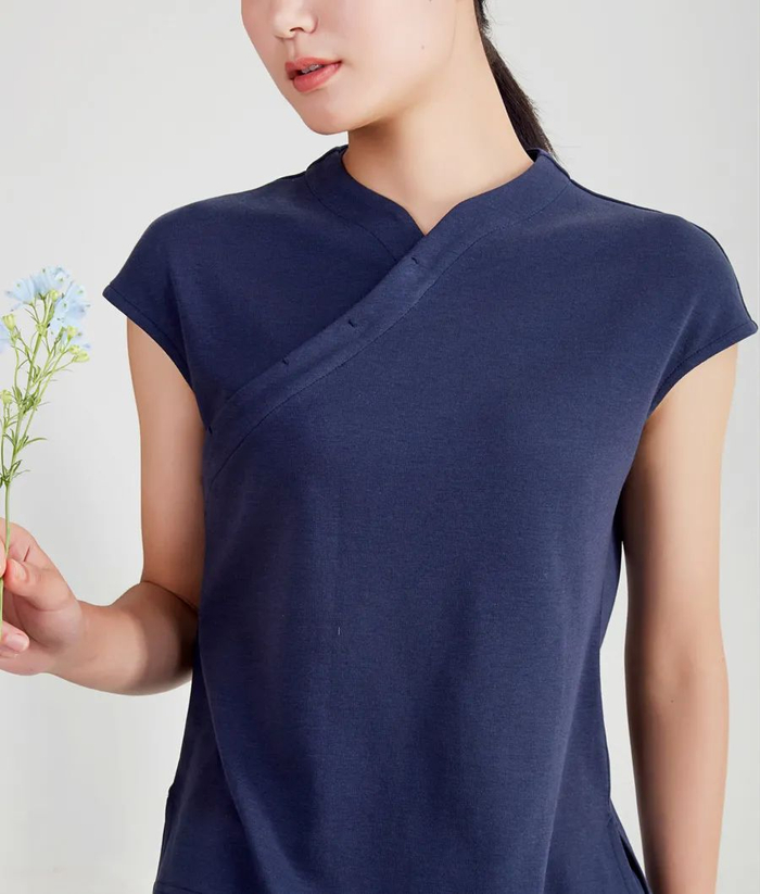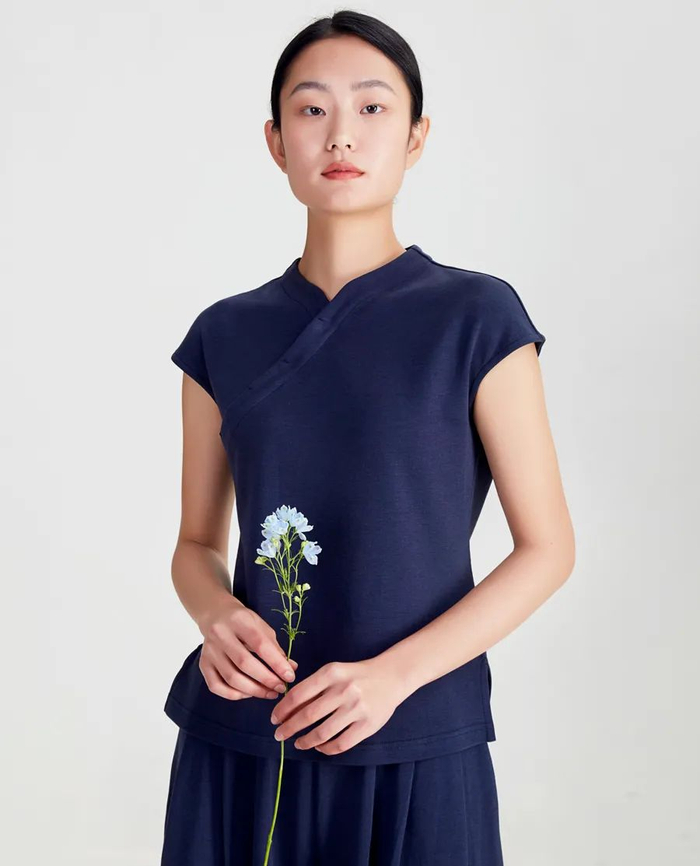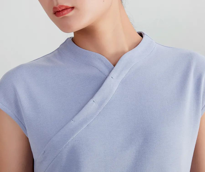 一般斜襟会搭配盘扣,但这款上衣做的是暗扣处理,扣子隐藏在衣襟里,保持了衣领的线条干净。