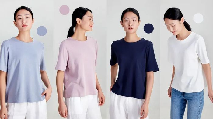 上衣有4色可选,白色、蓝色、粉紫色、藏青色。