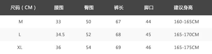 男款尺码表:
